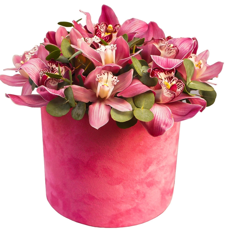 Букет состоит из 17 розовых орхидей, зелень, коробка, оазис.