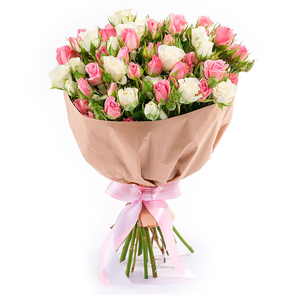 Букет состоит из 8 веток белых кустовых роз, 11 веток розовых кустовых роз, крафт, атласная лента.