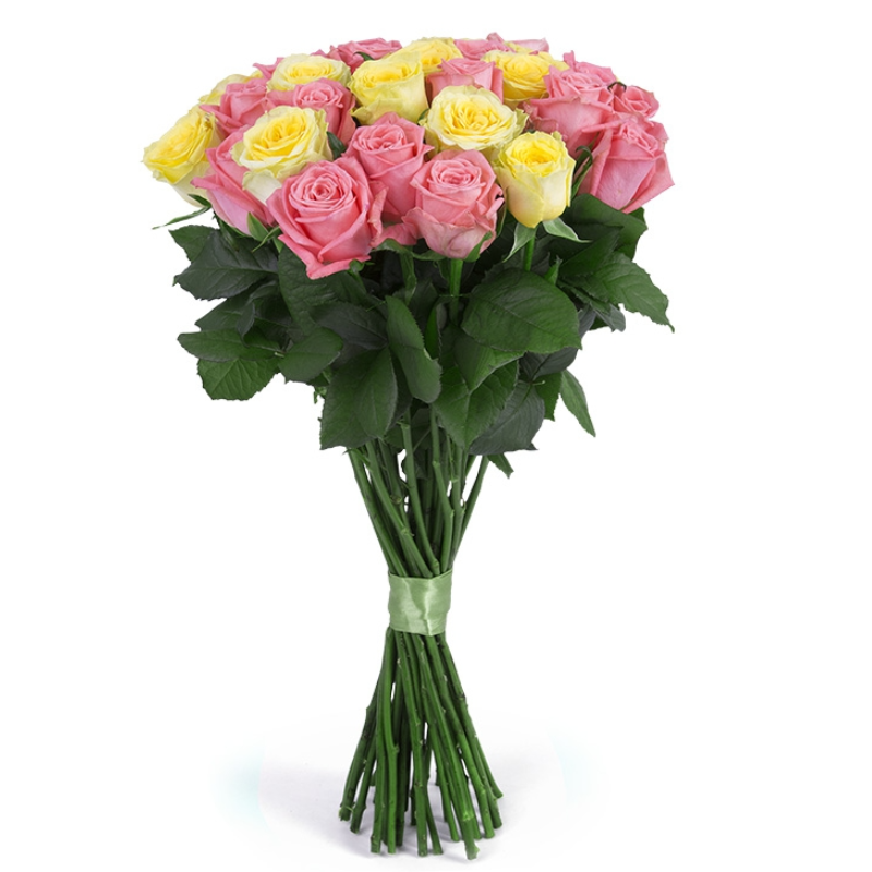 Букет состоит из 11 розовых роз, 10 желтых роз, прозрачная упаковка, атласная лента.